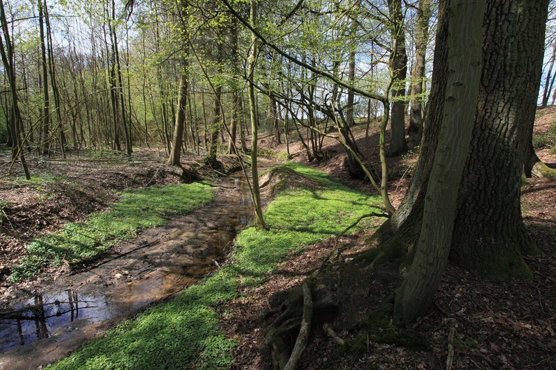 Auf „nur“ knapp 38 Hektar hat der heutige Betriebsleiter und Stiftungsvorsitzende Gerhard Brechmann die bei der ANW erworbenen Kenntnisse des kahlschlagfreien Dauerwaldes aus den ehemals weitgehend einschichtigen artenarmen Kiefern- und Fichtenforsten, unter Beachtung der in der Stiftungssatzung festgelegten Naturschutzziele, mehrschichtige Bestände verschiedener heimischer Baumarten entwickelt. Eine Ausnahme bilden sicher (noch) die durch den Okan Friederike und den Borkenkäfer entstandenen ca. 6 Hektar Kahlflächen, deren bereits durchgeführte Wiederbewaldung und jetzt anstehende Jungbestandspflege, wesentliche Punkte dieser Exkursion sein werden. Daneben werden Themen wie die konsequente Zurückdrängung der spätblühenden Traubenkirsche (Prunus serotina) durch Ringelung, inclusive einer praktischen Demonstration der Methode auf einem Nachbargrundstück, die Integration von Ilex durch Wertastung in das Waldbaukonzept, die Umsetzung des klimaangepassten Waldmanagements im Betrieb und das zum Betrieb gehörende Naturschutz- und FFH Gebiet Wehrbachtal (siehe Foto) vorgestellt.